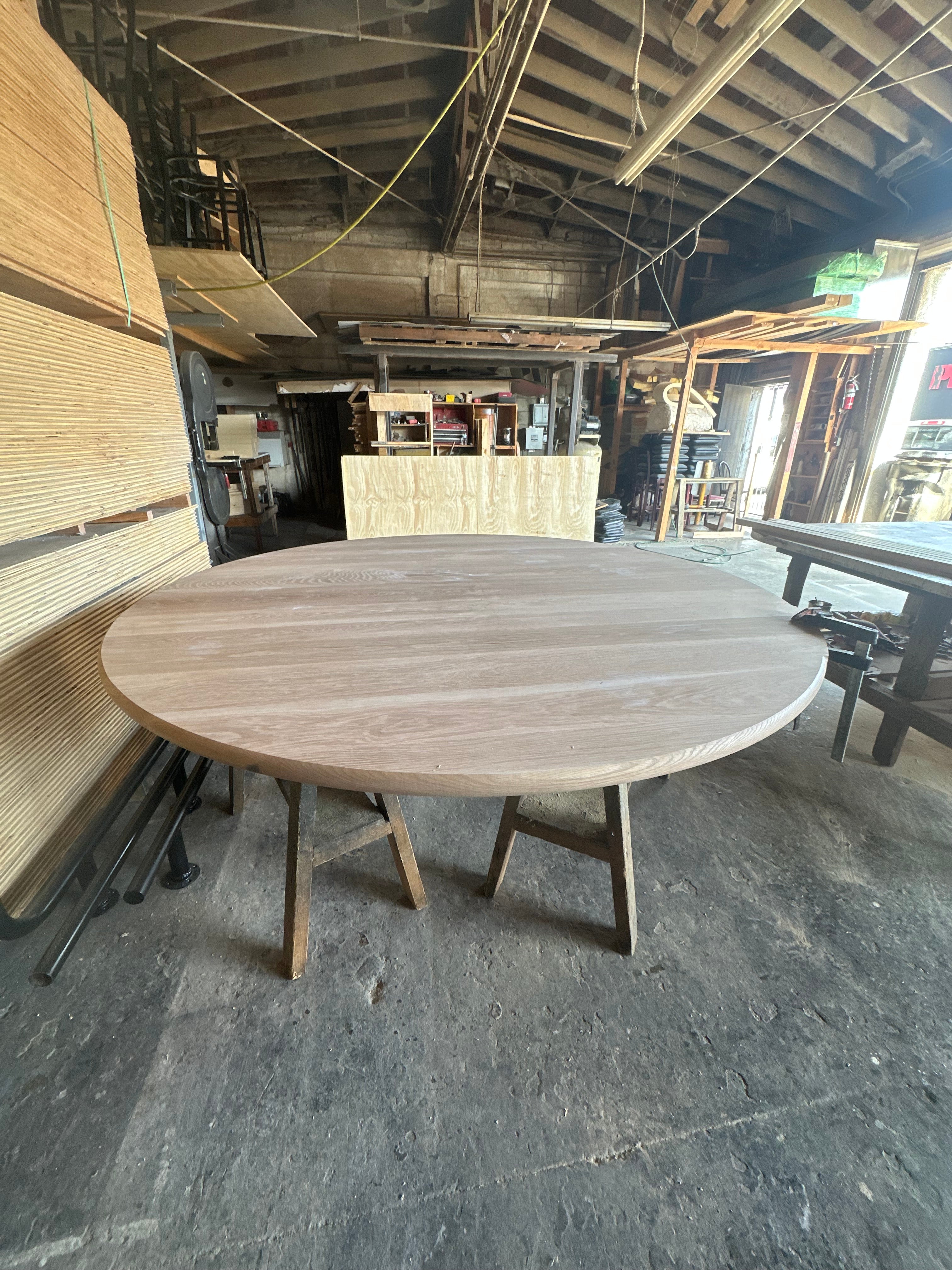 PICTURE IF SOME TABLES HERE IN SHOP BEFORE THEY'RE FINISHED. RAW. 7 FOOT ROUND SOLID WHITE OAK.